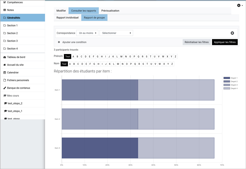 OTOPO était très attendu par l’équipe enseignante. Pour sa matière, chaque enseignant peut proposer à ses étudiants de s'auto-positionner sur les items/compétences associés à son cours et suivre leur évolution dans le temps. L’outil est intégré dans les ressources pédagogiques que les enseignants partagent à leurs étudiants.